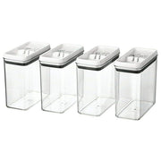 Keep your dry goods fresh with these Better Homes & Gardens Flip-Tite® Food Storage Containers. It is a handy item to have in your kitchen or pantry. These food storage containers are ideal for storing dry foods, such as pasta, dried beans, and candies. It's made without Bisphenol A (BPA) to ensure the safety of your food. A clear storage container makes it easy to identify the stored contents at a glance without having to label each canister. It features an easy-to-open flip buckle lid with food grade safe seal and is made of durable construction. This 4 pack set includes 4 of 11.5-cup rectangular container and 4 lids. Always wash before first use and remove seal from lid before wash. Allow all components to dry thoroughly before next use. Container and lid are dishwasher safe, and the silicone seal is hand wash. Not Microwave safe. Do not carry Flip-Tite Container by the lid.