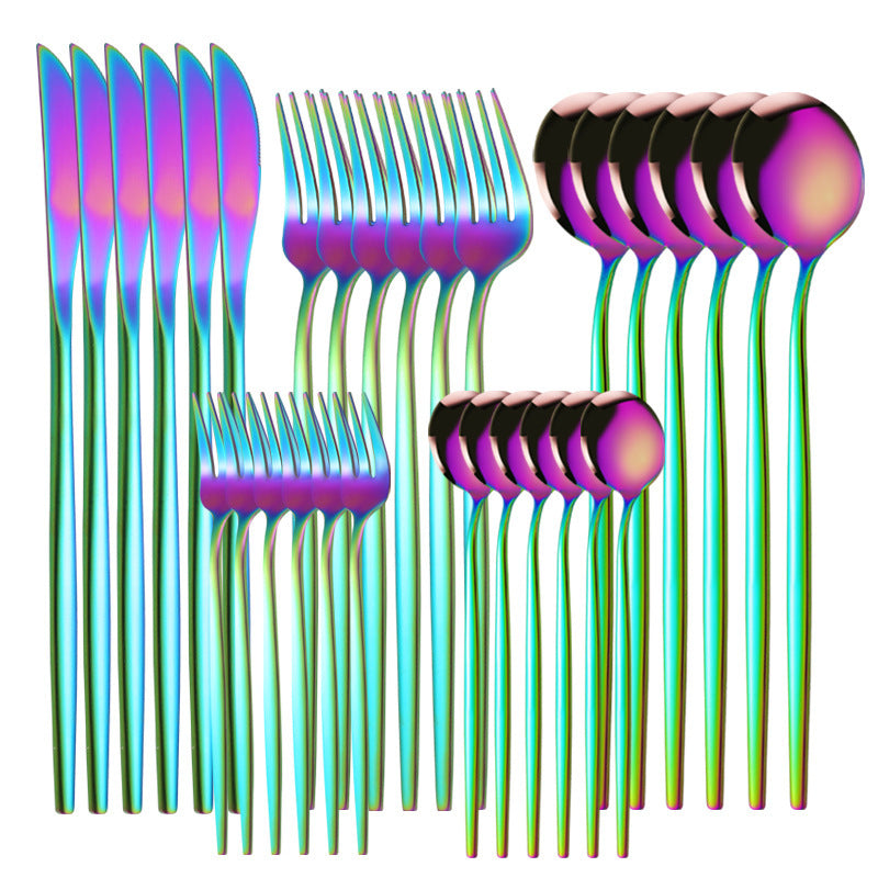 Product information: Color: silver, gold, black, black gold, green black, green silver Polishing Process: cloth wheel light (mirror polishing) Style type: simple style Function: Western tableware Material: Stainless steel Suit list: dinner knife * 6 spoons * 6 large forks * 6 small spoons * 6 small fork * 6 Packing specification: Suit Style: modern simplicity, western style